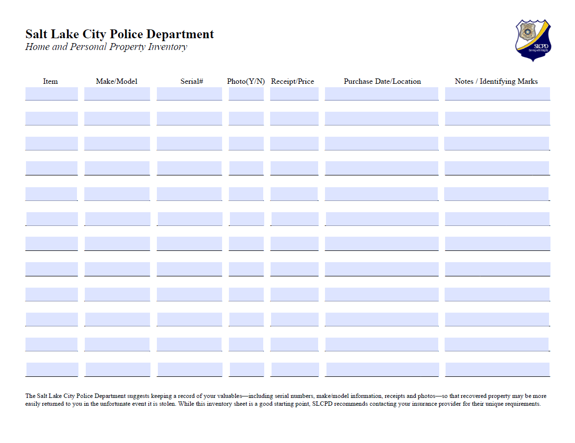 At any given time, SLCPD has hundreds of items in evidence that it would like to return to owners — property that can only be returned should the rightful owners prove their claims. The links below provide a suggested home inventory tracking sheet. Please check with your insurance provider for other documentation ideas.