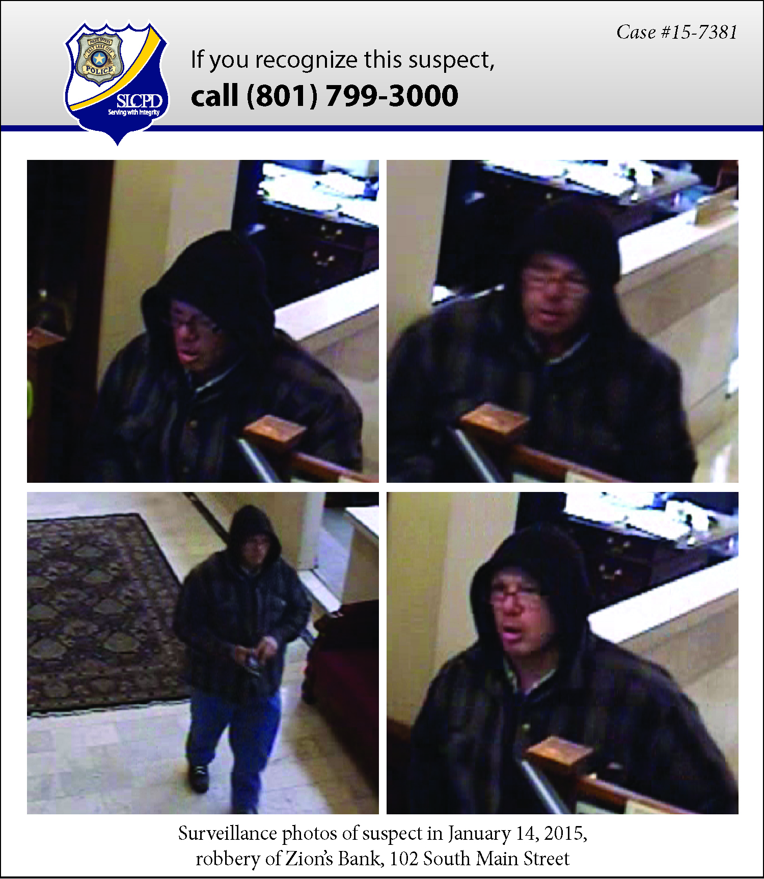 SALT LAKE CITY — The Salt Lake City Police Department seeks the public’s help to identify the suspect that robbed a Zion’s Bank located at 102 South Main Street.