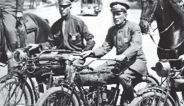 First motorcycle added to fleetMotors organized in 1909. Pictured is one of the first Motor Squads, circa 1913. Over the years, the squad has ridden Excelsior, Harley-Davidson, Kawasaki and BMW bikes.