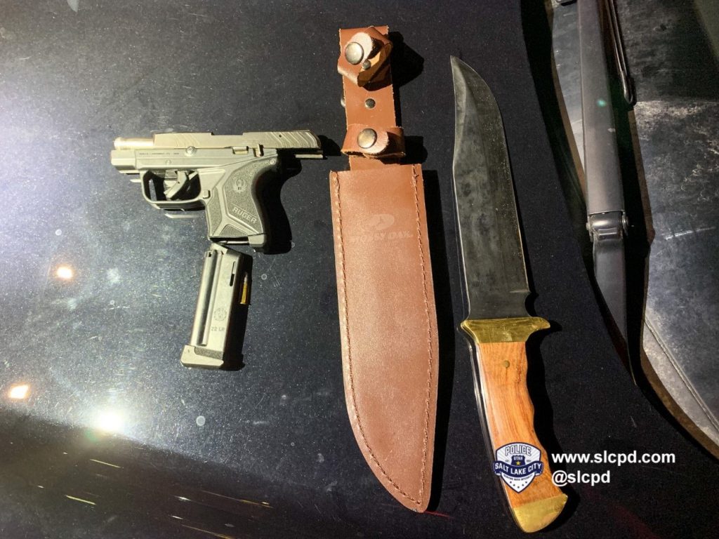 SLCPD Graveyard Patrol Officers Recover Gun, Illegal DrugsSALT LAKE CITY — Recently, graveyard patrol officers assigned to the Salt Lake City Police Department’s Pioneer Patrol Division arrested a 45-year-old woman and 49-year-old man accused of being in possession of illegal weapons and illegal drugs. This investigation started at 3:10 a.m. on Wednesday, February 8, 2023, when SLC911 took a call from someone reporting suspicious activity in the parking lot of a closed business near 900 West North Temple Street. Officers responded and spotted two people inside of a gray car. While talking with the driver, Elsi Cornejo, officers recovered a large knife from inside of the car and a loaded gun from Cornejo’s pocket. Officers determined Cornejo to be under the influence of illegal drugs, therefore restricting her from legally possessing any dangerous weapon. The passenger, later identified as Larry Clubbs, initially refused to identify himself to officers. Officers found a large folding knife, methamphetamine, and suspected fentanyl pills on Clubbs. Officers learned Clubbs is a convicted felon, which prevents him from possessing any dangerous weapons. During a search of the vehicle, officers recovered methamphetamine and a distributable amount of marijuana. Officers booked Cornejo into the Salt Lake County Metro Jail on one felony count of Possession with Intent to Distribute a Controlled Substance, one misdemeanor count of Possession of a Dangerous Weapon by a Restricted Person, one felony count of Possession of a Firearm by a Restricted Person, one misdemeanor count of Possession of a Controlled Substance, one misdemeanor count of Possession of Drug Paraphernalia, one misdemeanor count of Carrying a Concealed Firearm, one misdemeanor count of Criminal Trespass, and one felony count of Transporting Prohibited Items into a Correctional Facility. Officers booked Clubbs into the Salt Lake County Metro Jail on one count of felony Possession with Intent to Distribute a Controlled Substance, one misdemeanor count of Possession of a Dangerous Weapon, one misdemeanor count of Failure to Disclose Identity, one misdemeanor count of Criminal Trespass, and two counts of felony Possession of a Controlled Substance. Charges are only allegations, and every arrested person is presumed innocent unless and until proven guilty beyond a reasonable doubt. The Salt Lake City Police Department is not the custodian of record for jail booking photos. Utah Code 17-22-30 mostly prohibits the release of jail booking photos. Generally, a jail booking photo can only be released by the custodian of record after a conviction or when law enforcement determines the person is a fugitive or an imminent threat to a person or public safety. In Salt Lake City, the Salt Lake County Sheriff’s Office is the custodian of record for jail booking photos. A photo of the weapons recovered is being released. Media may use this photo with proper credit to the Salt Lake City Police Department.