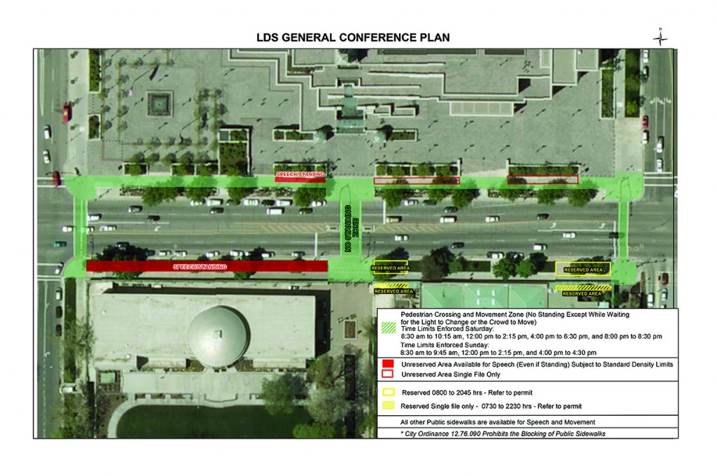 Map of pedestrian crossing areas, free speech zones on North Temple.