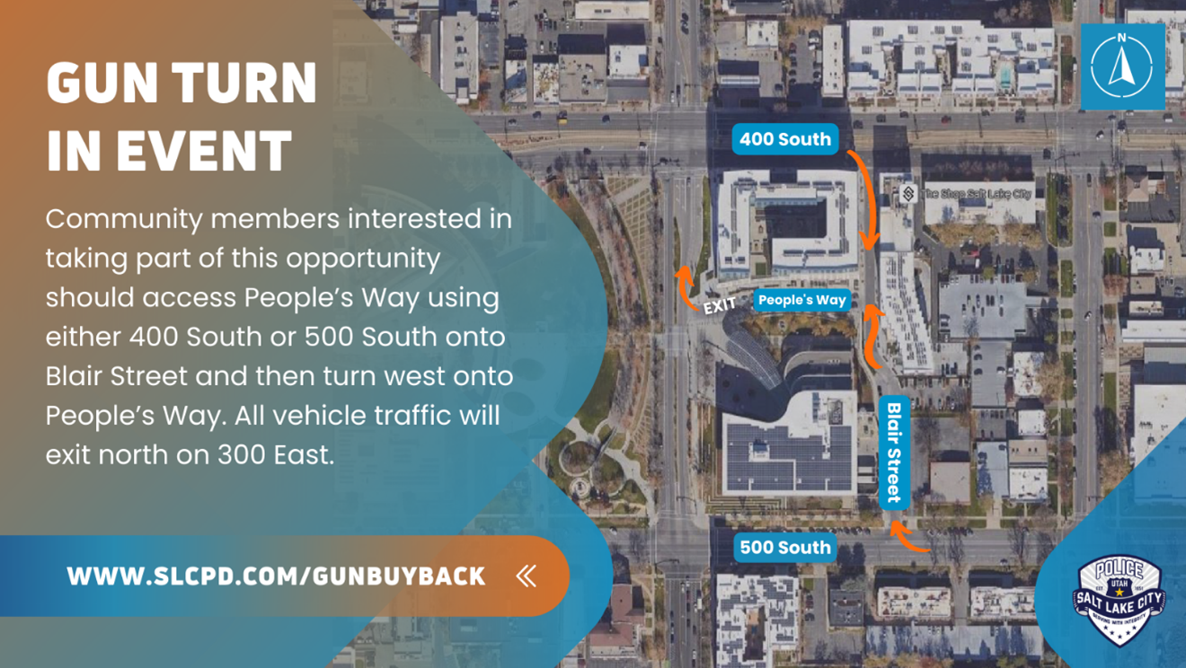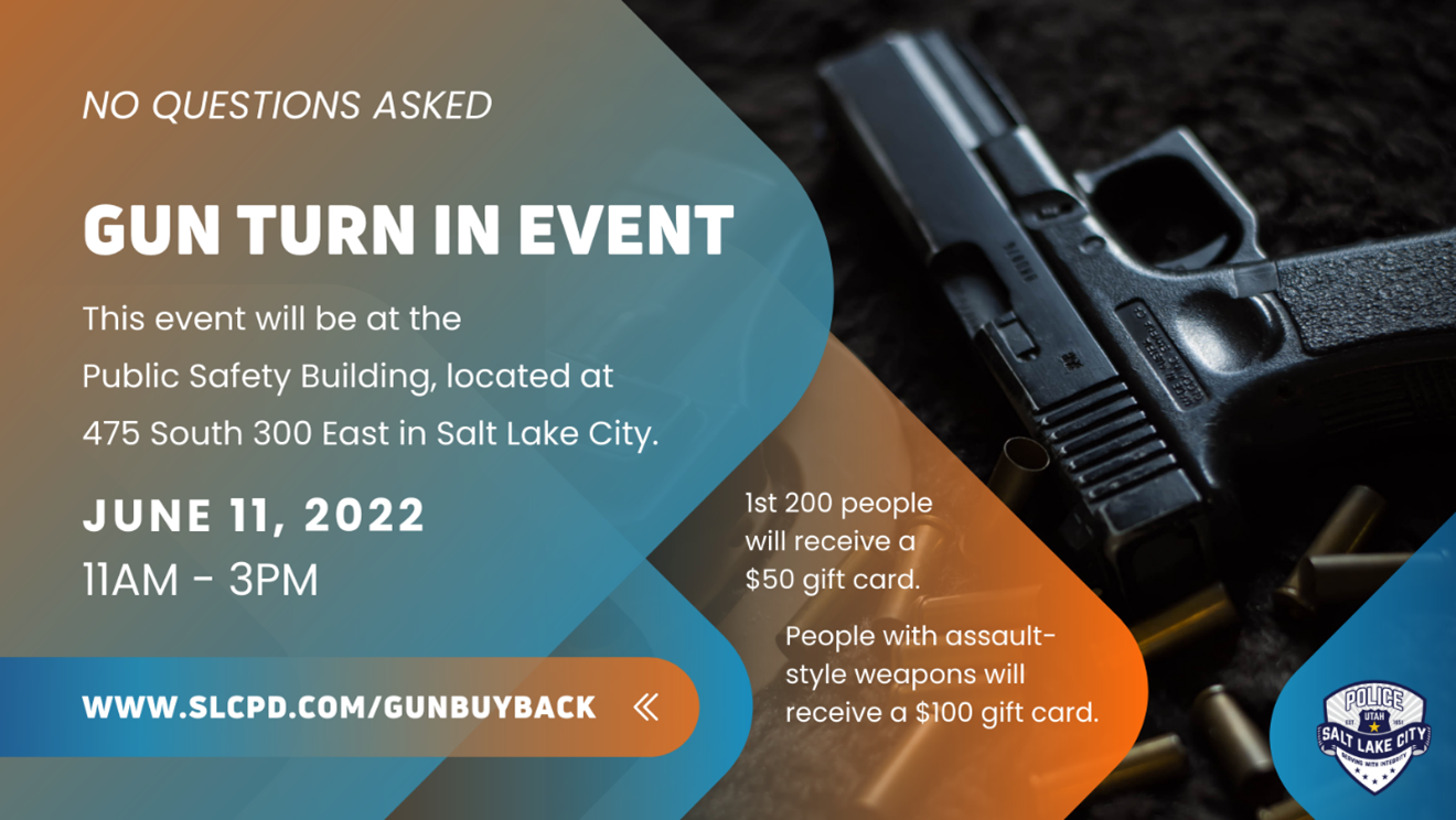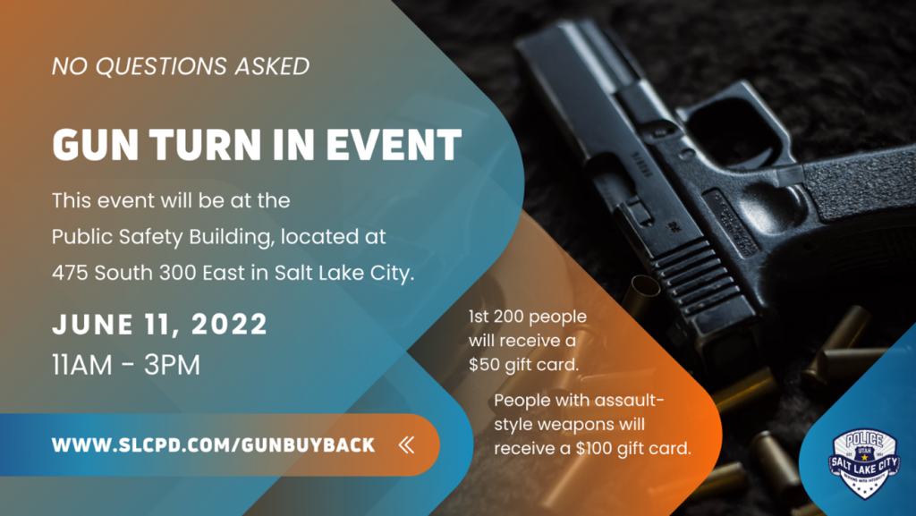 Happening Saturday: SLC Gun Buy-Back ProgramSALT LAKE CITY — The Salt Lake City Police Department, in cooperation with the Salt Lake City Corporation and the Salt Lake City Police Foundation will host a gun buy-back program on Saturday June 11, 2022 from 11 a.m. to 3 p.m. at the Public Safety Building, located at 475 South 300 East, Salt Lake City, Utah 84111. This will be a first-come, first served opportunity with a limit of approximately 200 gift cards. People will be able to turn in their firearms and receive a $50 gift card for firearms and $100 gift card for assault-style weapons, similar to AK-47, AR-15 and SKS model weapons. The SLCPD will maintain the ultimate determination on the eligible firearms for a $100 gift card. No more than one gift card will be provided per person, no matter how many firearms are turned in. No identification is needed and no questions about the firearms being turned in will be asked. More information is available here: https://police.slc.gov/gunbuyback/ In May 2022, the Salt Lake City Police Department seized 52 firearms. Community members interested in taking part of this opportunity should access People’s Way using either 400 South or 500 South onto Blair Street and then turn west onto People’s Way. All vehicle traffic will exit north on 300 East. This event will run until 3 p.m., even if gift cards run out. Anyone bringing a firearm to this event should do the following: · Have the firearm unloaded. · Have the firearm stored inside a safe storage container, such as a gunlock box and away from the driver or another occupant. · Communicate with officers on-scene. If you’re not sure if the gun is loaded/unloaded. Tell officers that and tell them where the gun is. · Comply with officers. The process may take longer for some people if they have more than one firearm, ammunition or if the gun needs to be secured by officers. · Maintain patience and safety at all times. Never exit your vehicle with your gun unless you are specifically directed to do so by an officer. Media interested in getting video of the event and an interview with Chief Mike Brown on Saturday should email PolicePRUnit@slcgov.com no later than 10 p.m. on June 10, 2022. Media availability will not last the entire length of the event. The Salt Lake City Police Department will not be able to coordinate interviews with people turning in any firearms. If a community member is not able to attend this event but still wants to turn in their firearm without collecting a gift card should call 801-799-3000. The gift cards available for this event were graciously supplied from the Salt Lake City Police Foundation. ### |